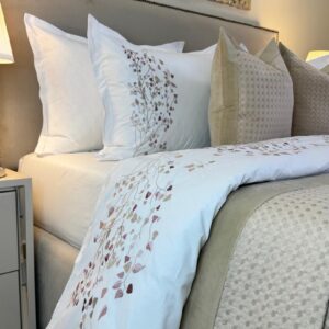 Sublimez votre chambre avec ce magnifique  ensemble de coussins et chemin de lit en brocard et velours, qui vient se poser délicatement sur une parure en 100% coton  brodĂ©e au fil de soie.