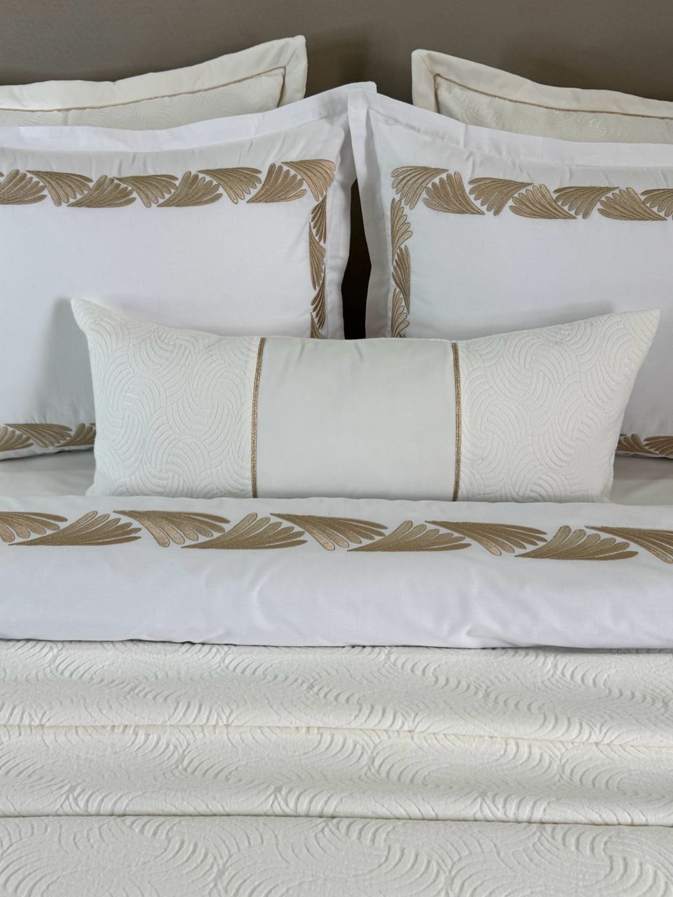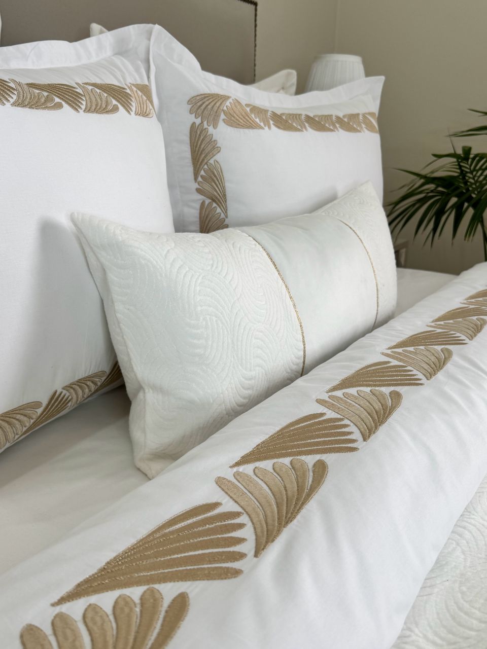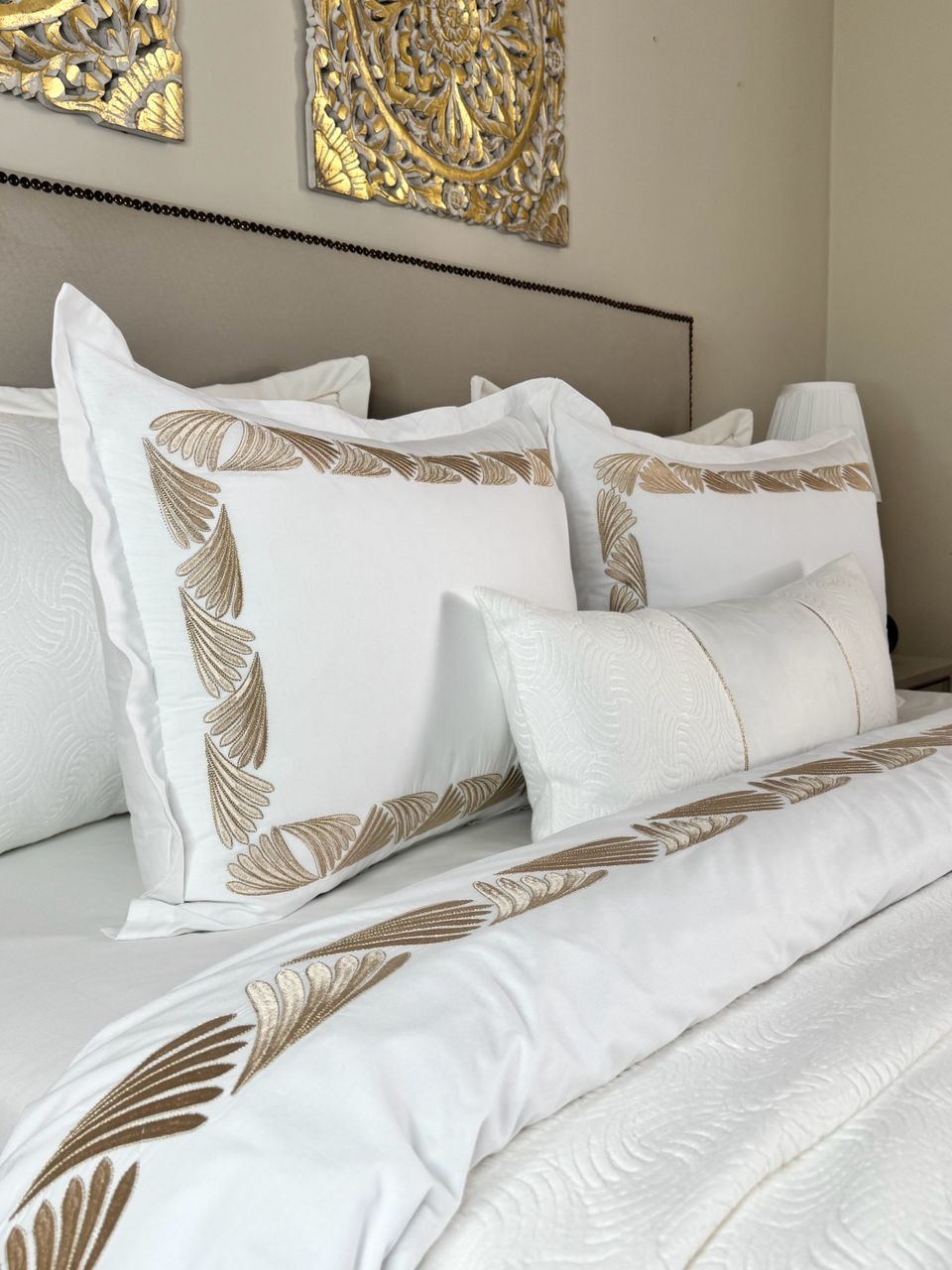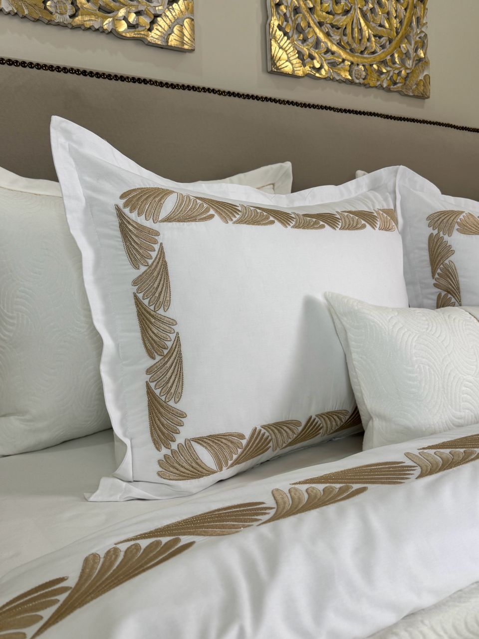 Parure housse de couette modÚle PERLA en 6 piÚces sur tissu 100% coton bio et brodée au fil de soie couleur or