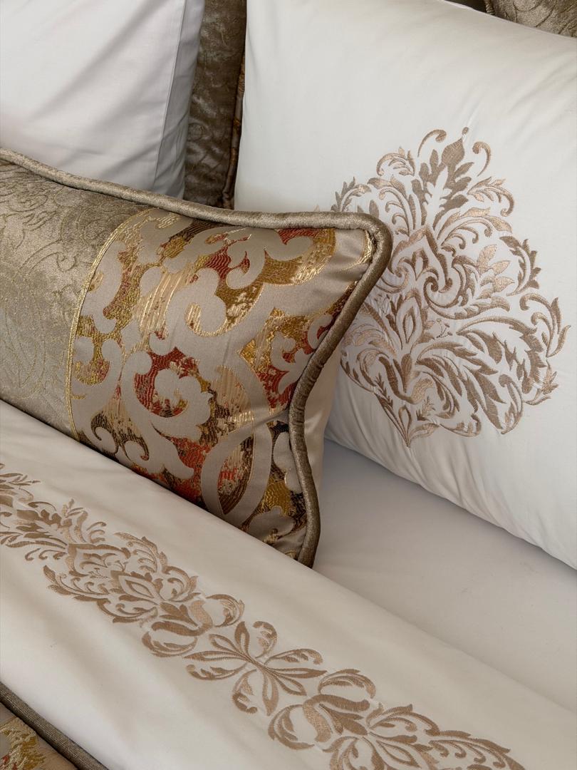 Parure housse de couette modÚle HERA en 6 piÚces sur tissu 100% coton bio et brodée au fil de soie couleur nude
